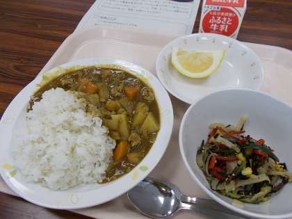 今日のサラダには「ひじき」が入っています。ひじきはカルシウム、食物繊維が豊富な食材です。たくさん食べてほしい食品の一つです。カラフルなピーマン、コーン、大根、きゅうりと、色鮮やかなサラダになりました。