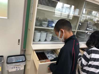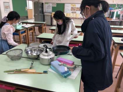 5年生になって、家庭科の学習が始まりました。今回は家庭科室の探検を通して、調理用具の名前や使い方を確認したり、安全な使い方について考えたりしました。
