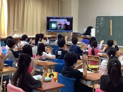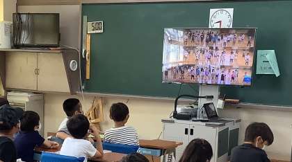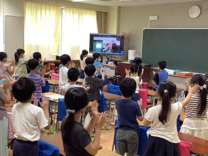 本来は2人組で向い合って遊ぶ手遊びですが、この日は、児童が画面の先生の動きに合わせて、手遊びを練習。最後は歌を聴きながら2つの手遊びを楽しみました。