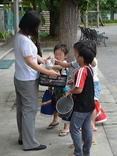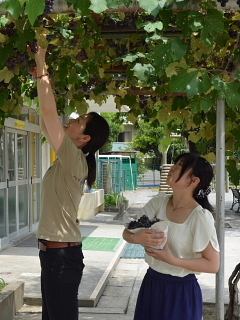 さっそく我が校の「ブドウ娘」??が収獲し、水泳が終わった子どもたちに配りました。