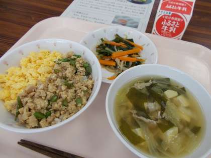 今日は卵の黄色と肉そぼろの茶色、さやいんげんの緑色で三色丼にしています。「そぼろ」とは豚や鶏のひき肉、魚やえびなどを汁気がなくなり、ぱらぱらになるまで炒ったものをいいます。今日は鶏肉のそぼろに凍り豆腐を加えて作りました。
