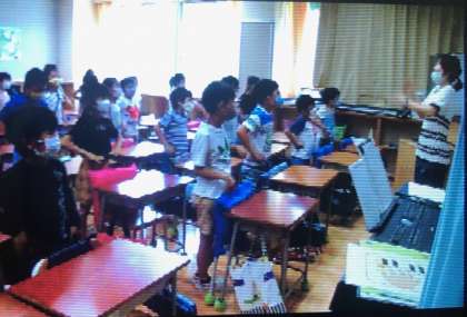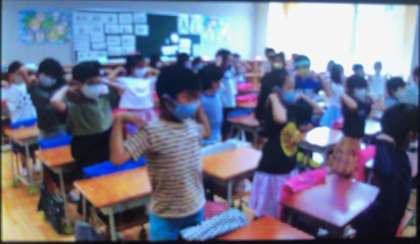 「ドレミの体操」の体操している写真です。体を動かしながら階名に親しむことができました!!2年生のみなさん、お家でも練習してみましょう!