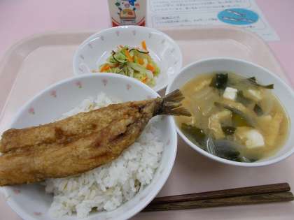 今日の「かば焼き丼」の魚は、いわしです。漢字で書くと魚に弱い「鰯」と書きます。陸に上げるとすぐに弱って傷みやすいところから、「よわし」が「いわし」と呼ばれるようになりました。いわしの油は血液をさらさらにする効果や脳の発達に役立つといわれています。骨に気を付けて、よくかんで、食べましょう。