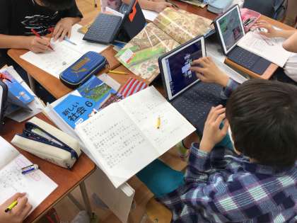 前回に引き続き社会の授業です。今回は、前回見出した「縄文時代と弥生時代ではなぜこうもくらしぶりが変わったのか」に焦点を当てて学習しました。「米」の保存性や安定性、栄養価を知り、その作り方を知ったことでなぜ「争い」が起こってしまったのか。資料を根拠に考えをもち、話し合いました。子どもたちの話し合いからは、「よい土地」「美味しい米」「しっかり働く人と働かない人」「知識が豊富な人」など、様々なキーワードが飛び交いました。