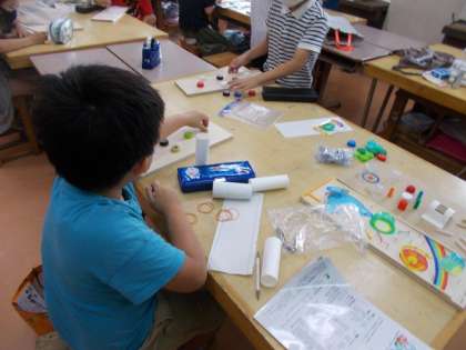 家からペットボトルキャップなどの材料をもってきて、工作を始めました。どんなものを作ろうかと、材料をいろいろ動かして考えていました。