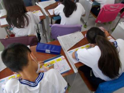 「向」という漢字に取り組みました。止め、はね、はらいに気をつけました。日々の積み重ねを大切に練習に励んでいます。