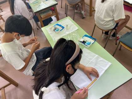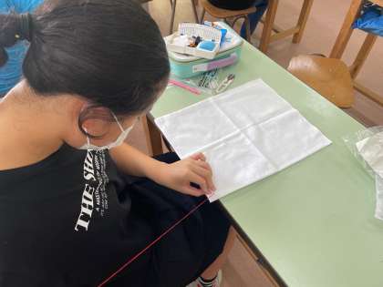 今日は、布巾の周りの刺繍をしました。縫う場所に印を付けて、波縫いをしていきます。縫い目の長さが変わったり、斜めになっていったりしないように注意をしながら、丁寧に縫っていました。完成が楽しみですね!