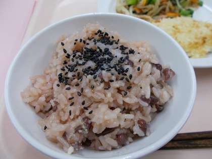 赤飯は記念日やお祭りなど、おめでたいときに食べるご飯です。もともとは強飯(こわめし)という神前に供えるご飯が、赤味がかっていたことに由来していると言われています。小豆といっしょに炊くのは赤味を付けるためです。今日は希望丘小学校の創立48周年です。赤飯でお祝いしましょう。