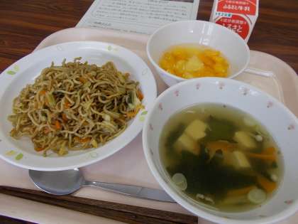 今日は、焼きそばです。給食で出てくる焼きそばにはいろいろあって、五目、ソース、塩、麻婆豆腐、あんかけ、そして今日のカレー焼きそばがあります。カレー焼きそばはカレー粉を使い、野菜などの具を味付けします。その後、麺を具と合わせる前に蒸し焼きにするのですが、その蒸し焼きする麺の方にもカレー粉をまぶしてカレー風味をつけます。カレー粉の風味は食欲を増進させてくれます。