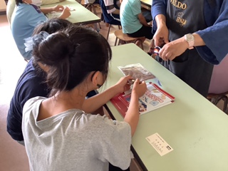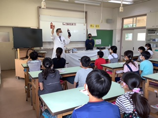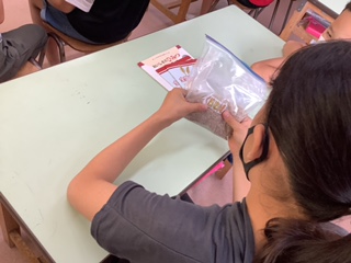しょうゆの物知り博士をお呼びして、日本人に馴染みのある「しょうゆ」について学びました。しょうゆの原料である「大豆」「小麦」「塩」と「麹菌」から「もろみ」ができることを知り、しょうゆになるまでの過程を目で見たり触れたりして確認することができました。