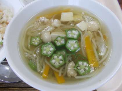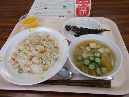 今日は七夕献立です。七夕とは7月7日の夜、天の川に隔てられた彦星と織姫が年に一度だけ逢えるという伝説にちなんだ行事です。今日の七夕汁はオクラを「星」、そうめんを「天の川」、にんじんは願い事を書く「短冊」に見立てています。年に一度の行事です。どうぞ、召し上がれ。