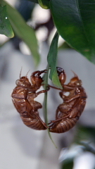 校庭の果樹が夏の日差しを浴びて大きく育ってきました。カリンはもうすぐ色づき始めそうです。夏ミカンもだいぶ大きくなってきました。ミカンの葉っぱにセミの抜け殻がちょうど対象の位置にくっついているのを見つけました。鏡で映したようですね。
