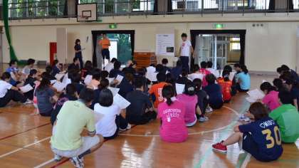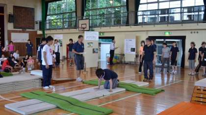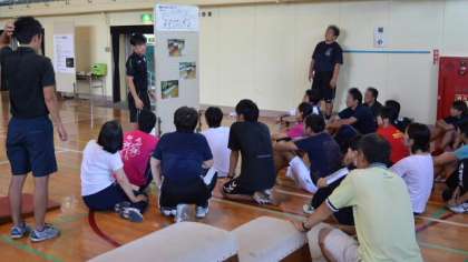 後半は「跳び箱」運動の基本的な指導のしかたについて、3つのブースをつくり、説明だけではなく、実際に子どもと同じように運動して指導のしかたを学びました。体育の時間を楽しく事故がないように指導できるように、どの教員も汗をかきながら一生懸命研修に励んでいました。各校体育主任ががんばり、充実した研修ができました。