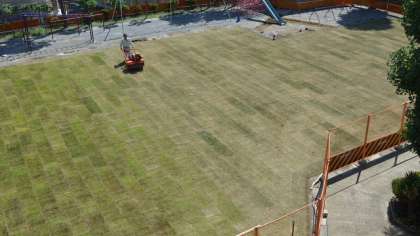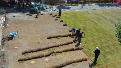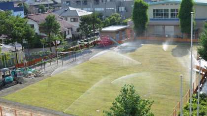 30日、今日1日で芝生がはりが終了しました。灌水用のスプリンクラーも設置され、はり終わった芝生にふんだんに水をかけました。緑の芝生で雰囲気はずいぶん変わりました。来校した際にご覧ください。9月いっぱいは芝生が根付くまで使用できませんが、本校の校庭は広いので3分の2が存分に使えますから大丈夫です。10月に使えるようになるのを楽しみに待っていてください。