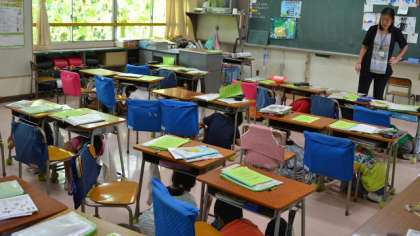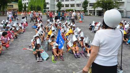 地震発生の放送で子どもたちは一斉に机の下にもぐり身を守ります。その後児童を校庭に避難させ保護者に引き渡すという訓練です。