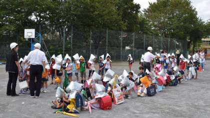 「避難開始」の合図で荷物等をまとめ防災ずきんをかぶった児童が校庭に集合しました。この頃には保護者、引き取り人も続々と集まってきました。