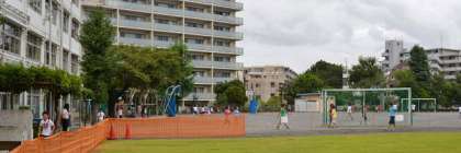 校庭西側の芝生方向から見た校庭です。新しくはった芝生は根がはって落ち着くまで9月いっぱいは養生期間として使用禁止です。休み時間、子どもたちは校庭東側3分の2を使って遊んでいます。