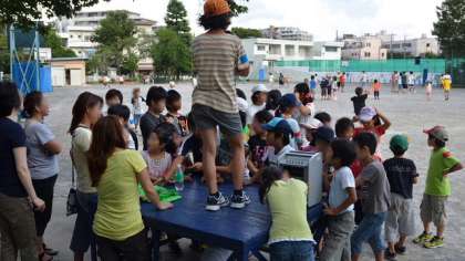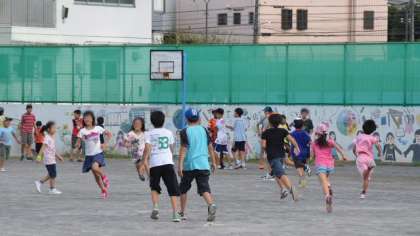 続いて「かんけり」「どろけい」で、みんな広い校庭を走り回り、大いに楽しみました。途中休憩で、ジュースを一人一本ずつもらって大喜びです。