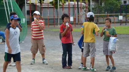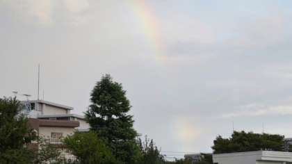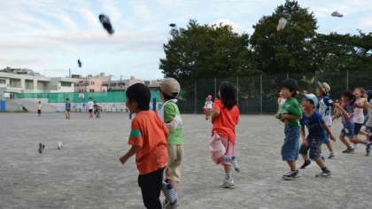 遊んでいるうちに日も傾き、東の空には虹も見えました。みんなで「靴飛ばし」で楽しみました。一番遠くまで飛ばした人にはポップコーンの賞品が出ました。