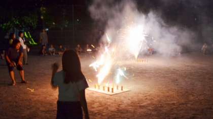 続いての花火は吹き出し花火です。子どもたちが取り囲む中、盛大に吹きあがる花火に歓声が上がりました。