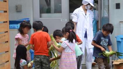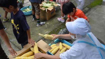 6日、今日の給食のメニュー、「蒸しトウモロコシ」に使うトウモロコシの皮むきを2年生が行いました。今日のトウモロコシは北海道富良野産。1学期もお手伝いをした2年生は、作業はもう慣れたもの。上手に細かいひげまでていねいに短時間でとることができました。