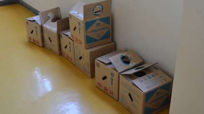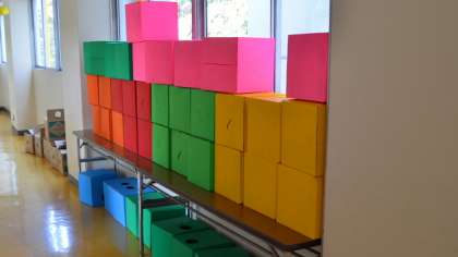 11月の展覧会に向けて、各学年が作品づくりに取り組んでいますが、図工室の廊下にカラフルな箱が・・・? もとはプールの滅菌薬が入っていた箱です。ディスプレイのために使うそうです。さて、どのように使われるのかこうご期待!