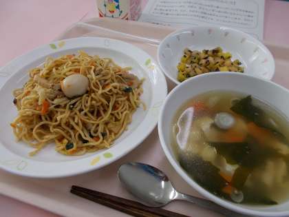 「お豆のかりんとう」は、大豆とさつまいもを油で揚げて、砂糖と牛乳を煮詰めたものを絡めています。大豆は私たちの体の血や肉になるタンパク質を多く含む食品です。大豆などの豆類が苦手な人でも今日のように油で揚げるとおはしがすすむのでお勧めです。たくさん食べてください。