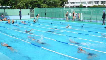 9日、晴れ渡った空のもと、1、2時間目に5、6年生が水泳記録会を行いました。開会式では6年児童代表が決意を語り、水慣れ、練習をしていよいよ本番スタートです。
