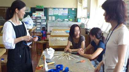 みかぐらの話題をもう一つ。10日午前、図工室で5、6年の運動会演技「みかぐら」で使う道具、「錫杖」の作り直し作業に、保護者の方が協力してくださいました。おかげさまで人数分がほぼできあがりました。ありがとうございました。