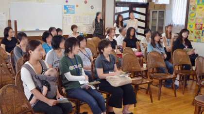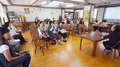 研修会後半は、長年この地域にお住まいで過去にはPTAや地域の数々の役割を担ってくださり、現在は避難所運営委員長である駒井さんのお話を伺いました。避難所訓練等に携わっていらした経験から、災害に備える心構え、地域の絆の大切さなどを熱心に語っていただき、参加者の皆さんもうなずきながら耳を傾けていました。