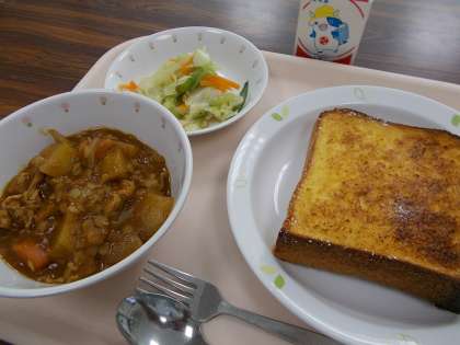 フレンチトーストは、アメリカやヨーロッパ・アジアなどで、幅広く朝食や軽食として食べられています。卵と牛乳、砂糖を混ぜた液に食パンを浸して焼いたものです。今日は牛乳の代わりにオレンジジュースを使い、ほんのりオレンジの香りがするフレンチトーストに仕上げました。