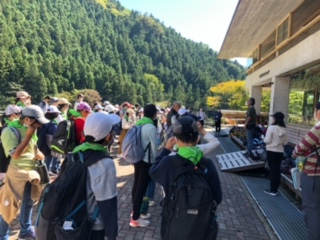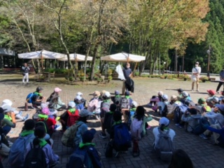 ふじやまビレッジに到着し、お昼ごはんを食べ終わりました。開室式で指導員の方からゴミの分け方を教えてもらいました。
