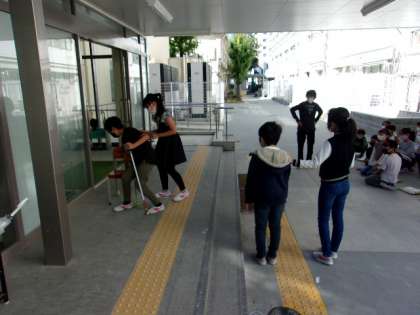 今、4年生は、総合的な学習の時間で「共に生きる」という学習に取り組んでいます。テーマは福祉です。今週から来週にかけて、目の不自由な方々について学習しています。今日はアイマスクをして白杖を持って、目が不自由であるのはどんな感じなのか体験学習をしました。