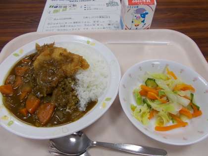 明日は待ちに待った運動会ですね。練習した力がしっかりと発揮できるように、今日の給食は「勝つ」にかけて「カツカレーライス」です。たくさん食べて今日までの疲れを吹き飛ばし、本番に備えましょう。あした、天気になりますように。