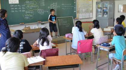 この写真は算数少人数担当教諭による授業です。こちらは、4人の並び方について実際に人を並べることから考えました。