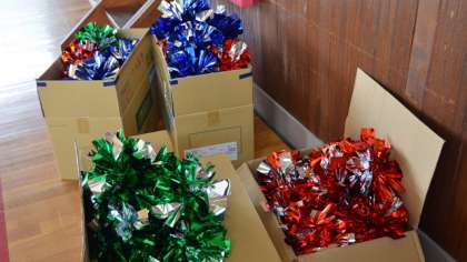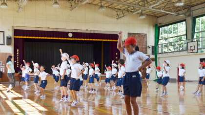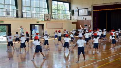15日から「運動会特別時間割」が始まり、運動会に向けての練習が本格的に始まりました。写真は3、4時間目の1、2年生の演技の練習です。保護者の方にも手伝っていただいて作った小道具を使います。暑い体育館の中ですが、みんな張り切って練習していました。