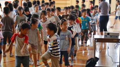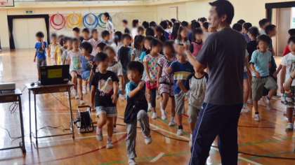 16日の音楽集会の話題をもう一つ。集会が終わって退場する時のようすです。退場の音楽に合わせて足踏みをしているところです。運動会などで行う足踏み行進。あらゆる機会を通じて指導を積み重ねることによって、子どもたちは一つ一つのことができるようになってきます。運動会の行進練習の時だけがんばってもできるものではありません。