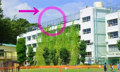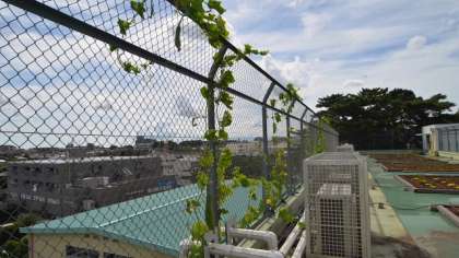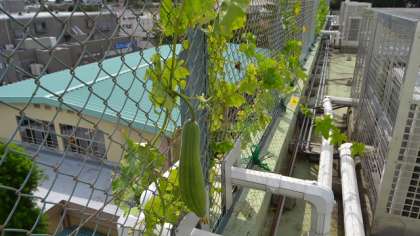 屋上にとどいたグリーンカーテンのことは以前紹介しました。屋上に上ってみるとそこにはしっかりヘチマがなっていました。地上から約15mほどの高さまで伸びてきたヘチマの生命力に感心するばかりです。