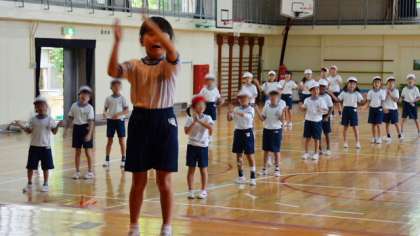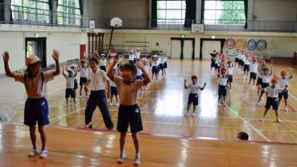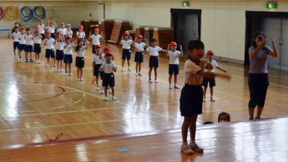 21日、台風が近づく中、体育館で1、2年生が運動会に備えて練習しました。今日は「マルモリ玉入れ」の練習です。「マルモリ」と言えばあれです。さあ玉入れとどう関係するのでしょうか?。知りたい方は10月1日の運動会にぜひおいでください。「小さな先生?!」が舞台に立ってみんなのダンスの見本になりました。