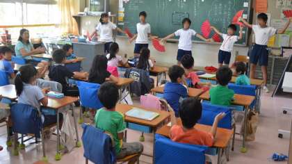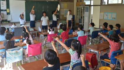 台風一過の22日朝、1、2年生の教室を応援団が訪れて応援練習をしました。初めて運動会の応援をする1年生に、来週の全体練習を前にして教えるのが目的です。応援団はさすがリーダー。わかりやすくていねいに説明していました。2年生は1年先輩として、自分から大きな声で応援して、見本となっていました。
