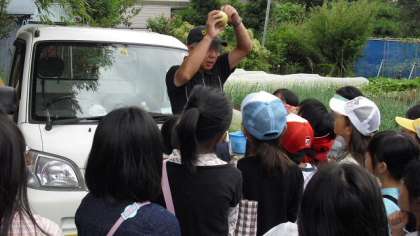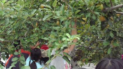 リンゴのもぎ方を教えてもらっていよいよ収獲。みんな自分で選んだりんごをもいで、うれしそうでした。