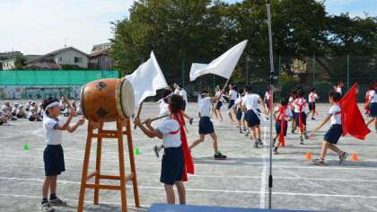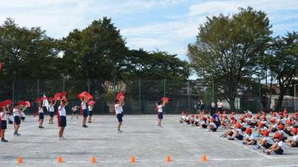 次に開会式の後に行う応援の練習をしました。応援団は連日の練習でちょっと疲れ気味。それでもがんばるリーダーにみんな協力して大きな声を出していました。