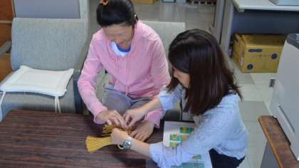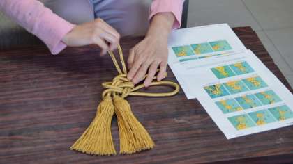 28日放課後、明日の運動会全体練習に使う校旗、優勝旗の整備をしていたところ、両方の「飾房(かざりふさ)」がほどけていることを発見。急遽インターネットで飾りについて検索して「菊結び」という結び方であることがわかりました。そこで、図工専科教諭と事務主事が、説明図を見ながら作成に挑戦。写真のように見事に完成させました。
