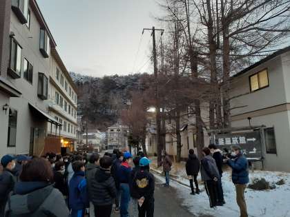 2日目、全員時間通りに集合しました。美しい冬景色に囲まれる中、元気よく挨拶をして始まりました。