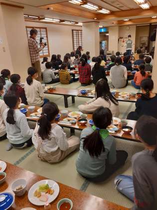 朝食の時間です。今日のミニハイキングに向けて、みんなたくさん食べています!