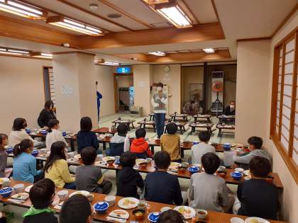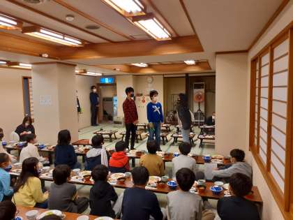 食事の際は、学校での給食と同様、ここでも黙食。本当なら同じ部屋の友達といろいろ話ながら食べたいところですが、みんな我慢しています。そこで少しでも食事の時間が楽しくなるよう、食事係の子どもたちが「いただきます」の挨拶の前にミニ劇を披露してくれました。今朝のミニ劇は「エルコス」の続編です。和やかな雰囲気をつくってくれた食事係の子どもたちに感謝です!