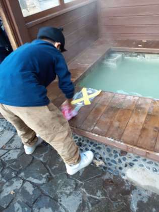 湯元温泉の源泉をひいた足湯に浸かりました!足湯に浸かりながら望む景色は最高でした!後に使う人のことも考えて、使った場所をしっかりときれいにしていました。さすが6年生!