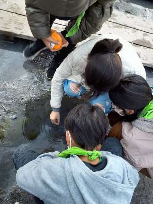 足湯の後は、湯元の源泉に行ってきました。「10円玉、綺麗になるかな?」とドキドキしながら洗っていました。
