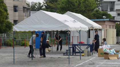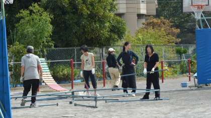 午前中から学校主事と手の空いている教員で、テントを設営しました。児童数、職員数が少ない本校では、午後の準備の時間に一気にとはいかないため、このようにできることを少しずつやっています。