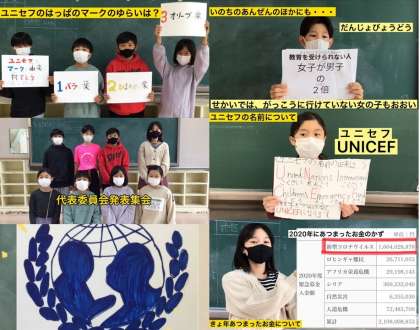 ユニセフの名前の由来から詳しい活動の内容まで、クイズを交えながら、とても分かりやすく楽しい、委員会発表でした。